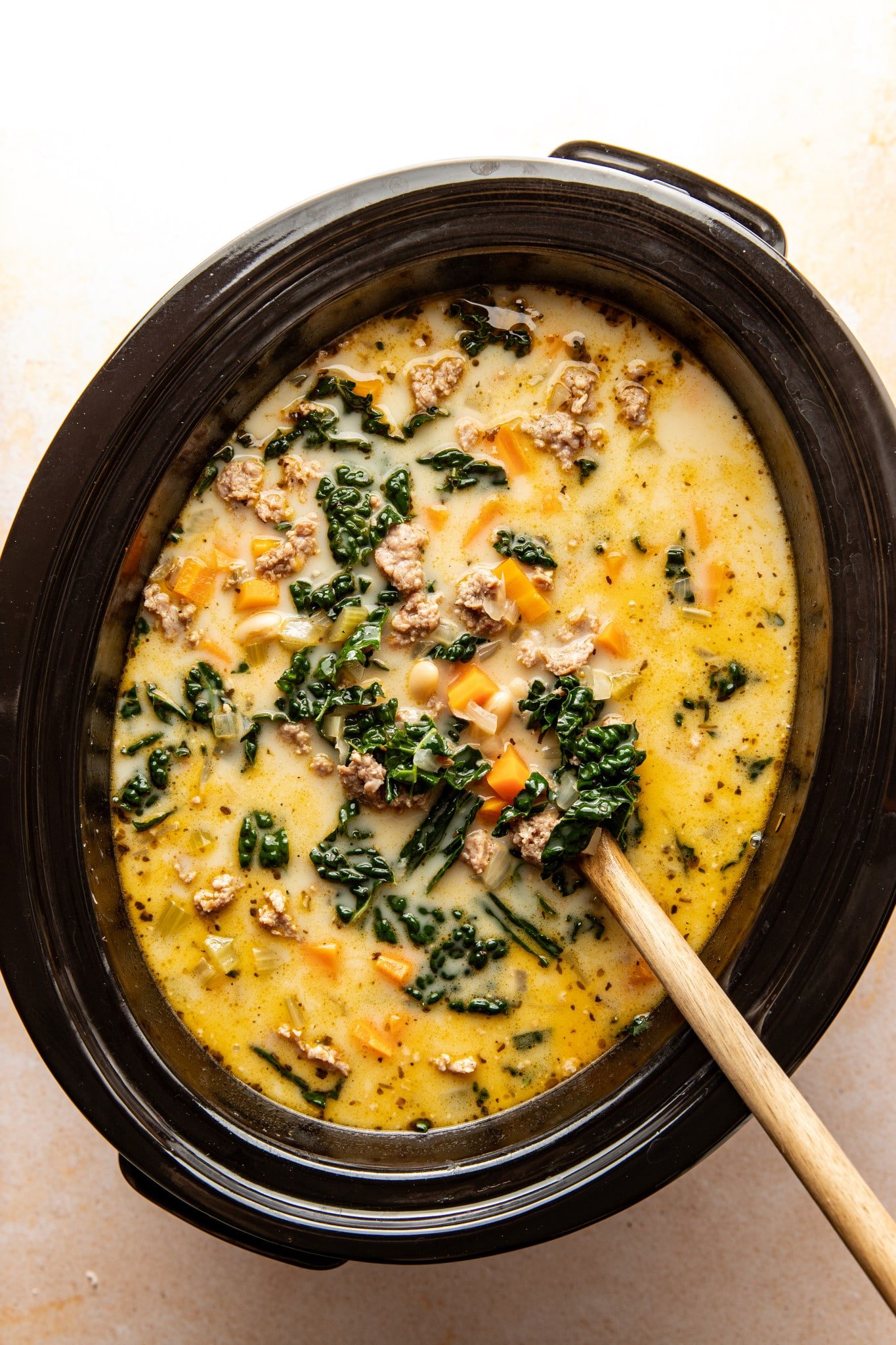 Layer the main soup ingredients in the slow cooker and stir to combine.