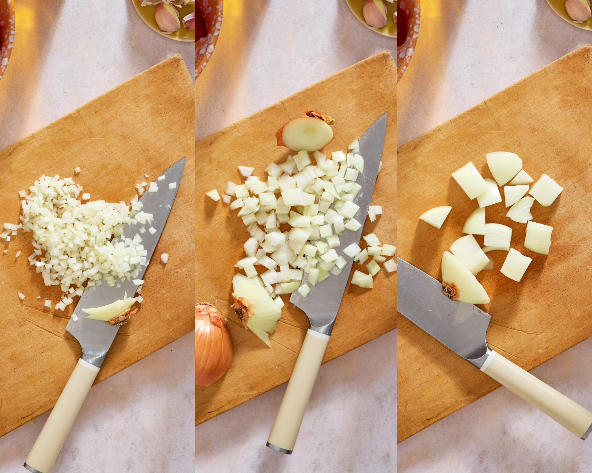 This is great for: Small diced onions are ideal for garnishing tacos, using for soups, sauteing, and casseroles. Use medium-sized diced onions in stir fry or chili. And lastly, use the large dice size for skewers, hearty stews, or kebabs!