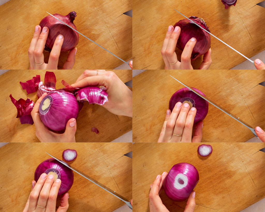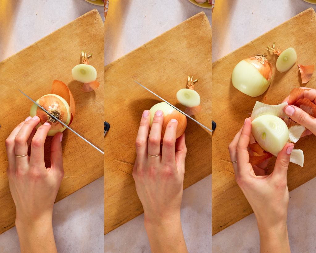 • Slice and peel: Slice off about half an inch from the top and the bottom of the onion and peel.