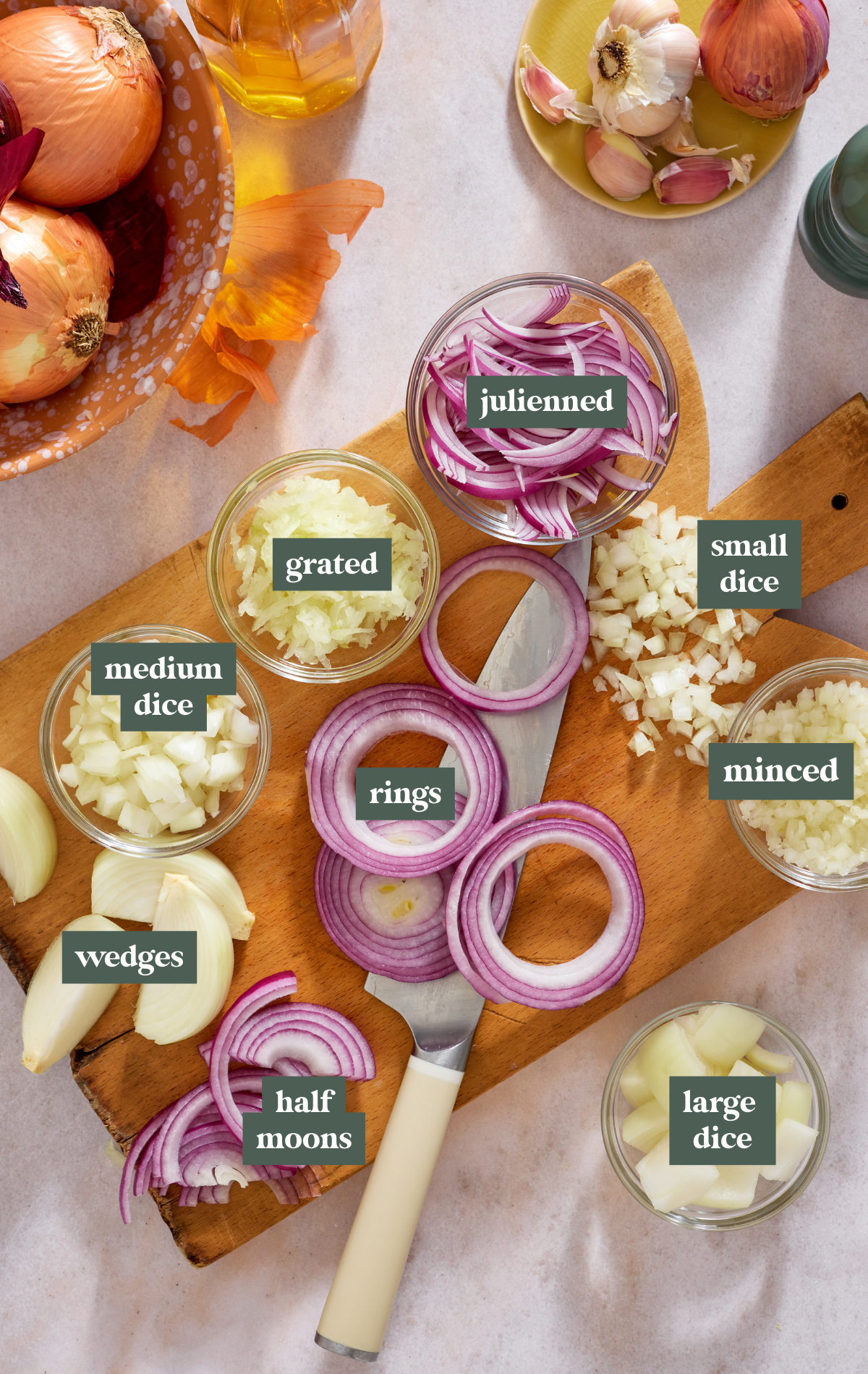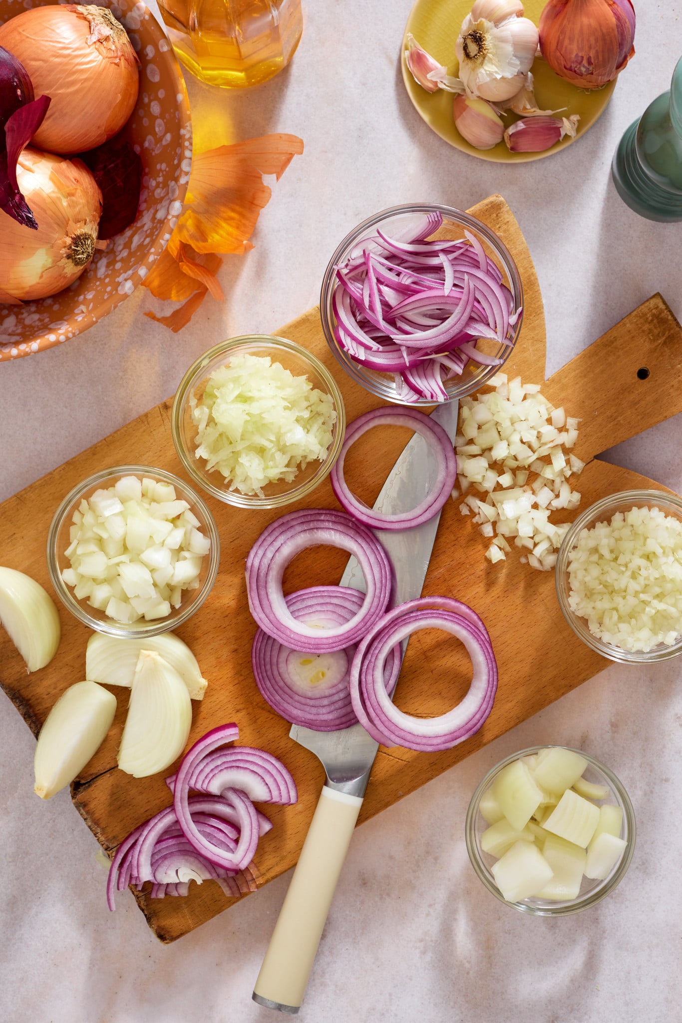 Learn how to cut an onion 7 different ways with step-by-step tips, plus practical tips like how to prevent tears and remove onion smell from hands and cutting boards.