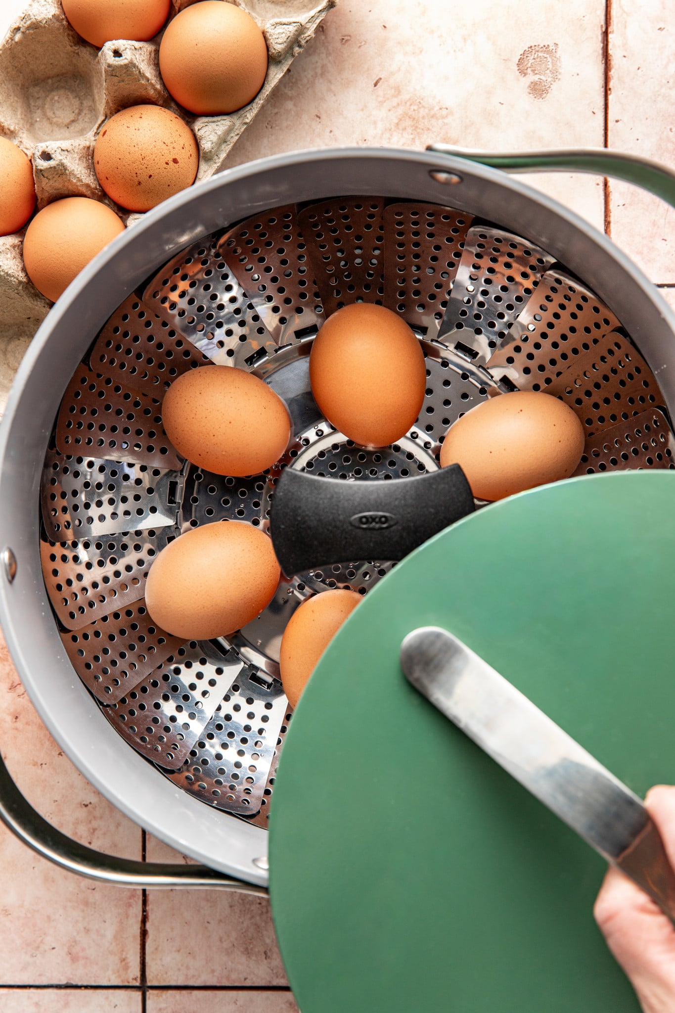 - Add the eggs: Remove the pot briefly from the heat. Carefully place eggs into the steamer basket in a single layer. Return the pot to the burner and keep the heat at medium-high.6-12 eggs