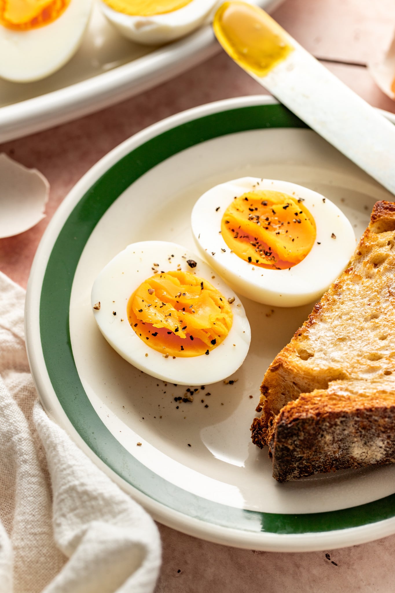 Steaming cooks the eggs with hot vapor instead of fully submerging them in water. This gentle, even heat helps prevent overcooking, so you’re more likely to get tender whites and creamy yolks. One of the biggest perks is how easy they are to peel (the steam helps separate the egg from the shell membrane), which means fewer frustrating, stuck-on shells. It’s also a bit more forgiving, so you’ll get consistent results even if your timing isn’t perfect.
