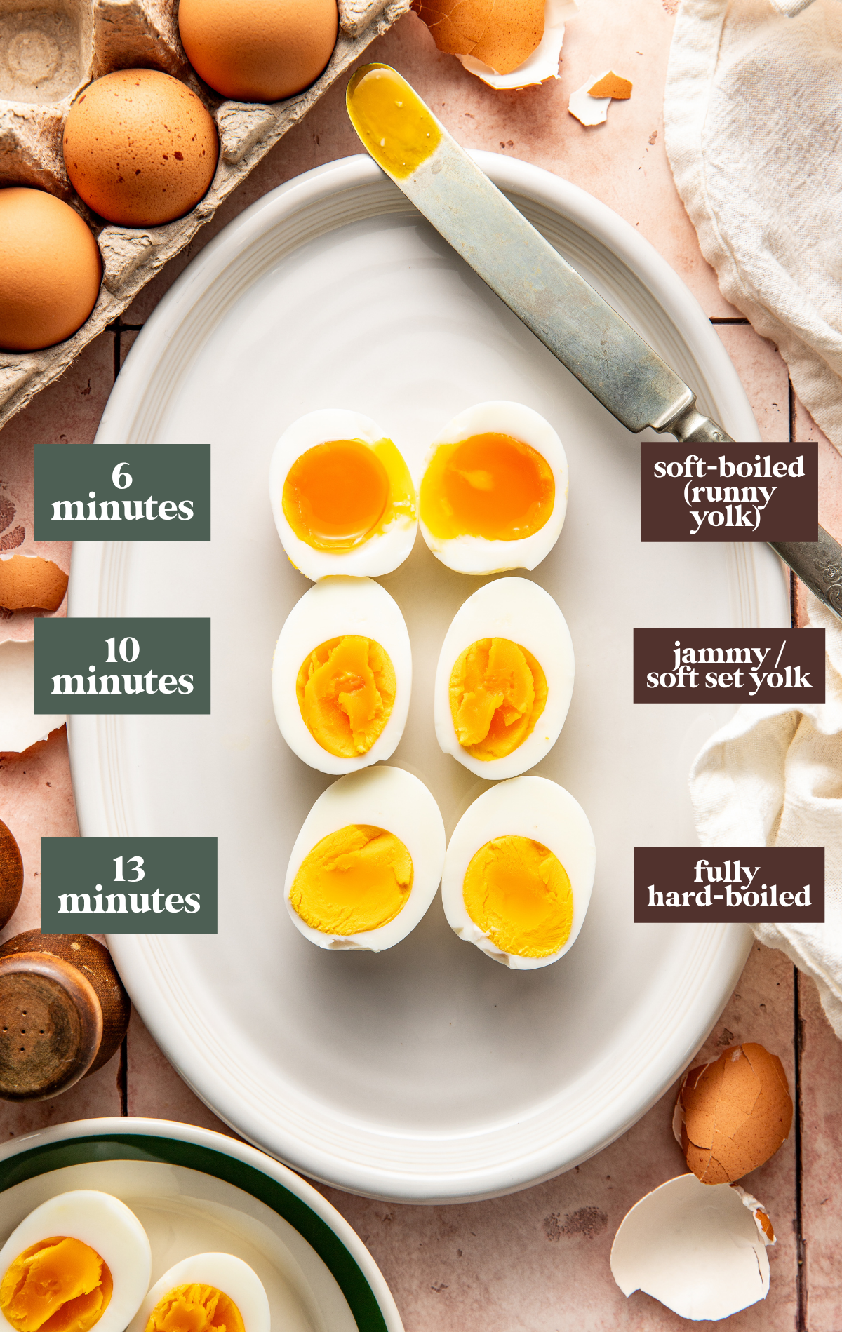 - Cover and steam: Cover the pot with a tight-fitting lid and begin timing: 6 minutes → Soft-boiled (runny yolk) Start Timer10 minutes → Jammy / soft set yolk Start Timer13 minutes → Fully hard-boiled Start TimerIf cooking a larger batch, you may need a slightly larger pot and possibly 1-2 additional minutes. If cooking a full 12 eggs, it can take closer to 14-17 minutes for a fully cooled hard-boiled egg.