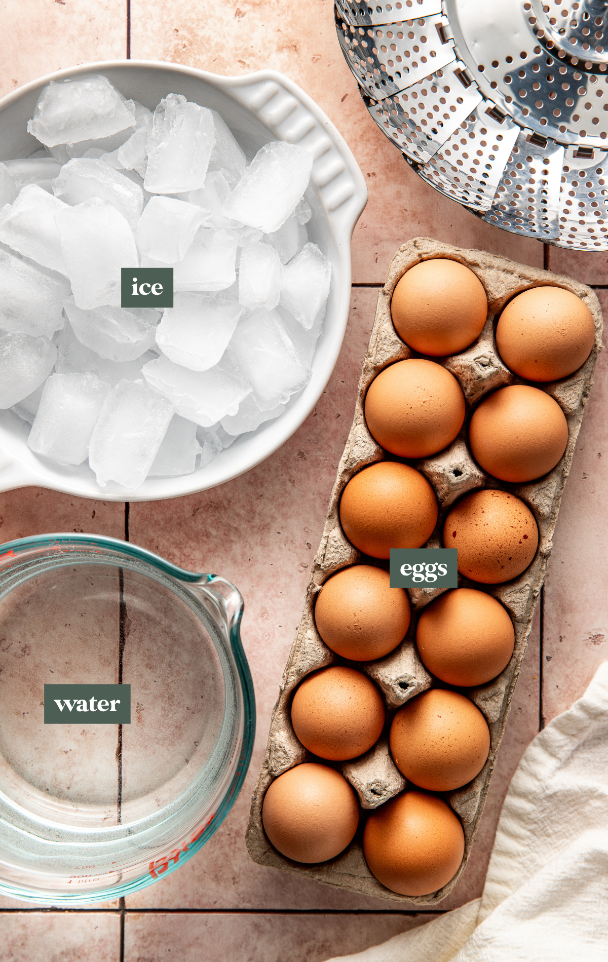 - Ice: The ice bath is crucial for easy-to-peel hard-boiled eggs. This immediately stops the cooking process and helps make the eggs easier to peel. The longer the eggs chill, the better they release from the shell. I found that just 15-minutes in the ice bath resulted in the easiest peel, but you can of course, let them chill longer!