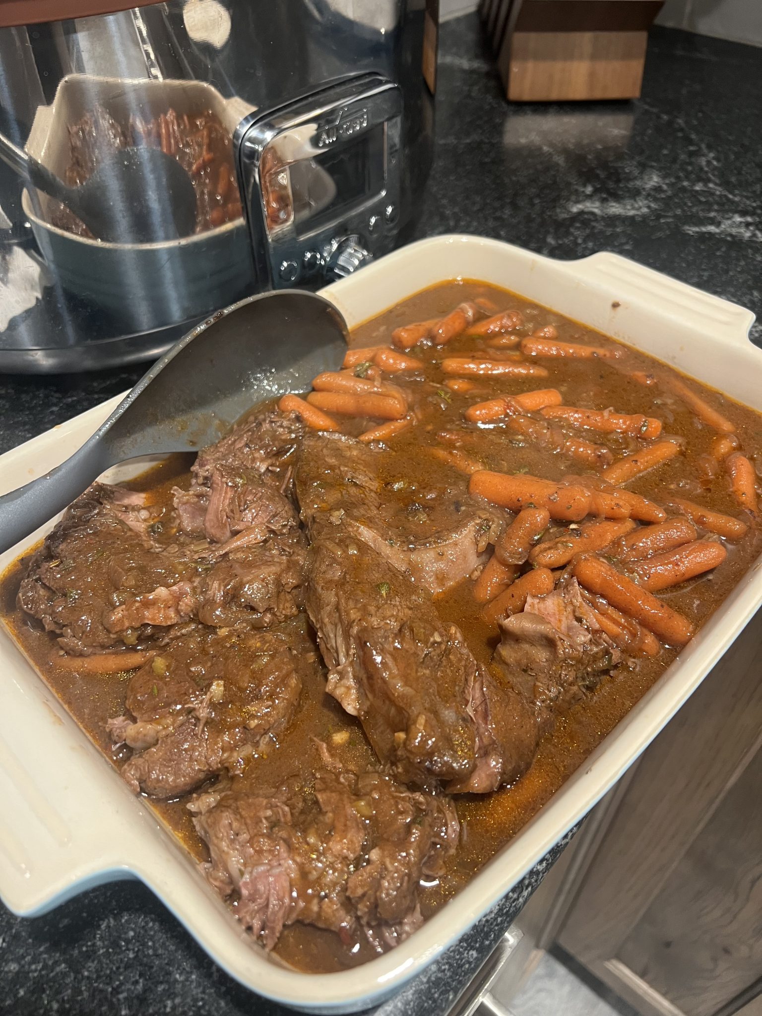 Delicious roast! A little more work than my normal crockpot meal (dump everything in and stir) but so worth it! The sauce is yummy and the beef was so flavorful. I baked potatoes with it because I didn’t feel like making mashed potatoes but next time I’ll cook egg noodles and have a baguette to soak up that sauce!