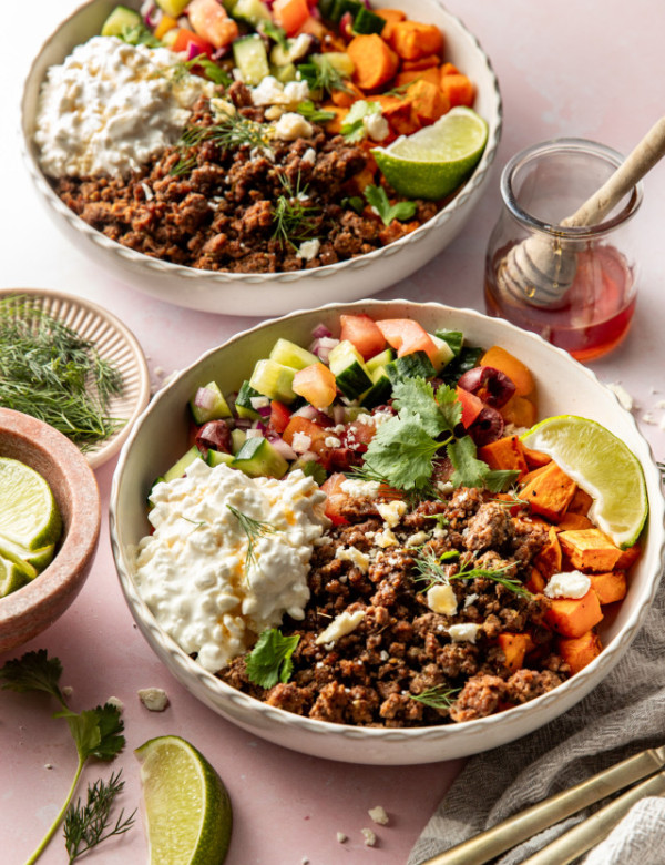 Mediterranean Ground Beef Sweet Potato Bowls