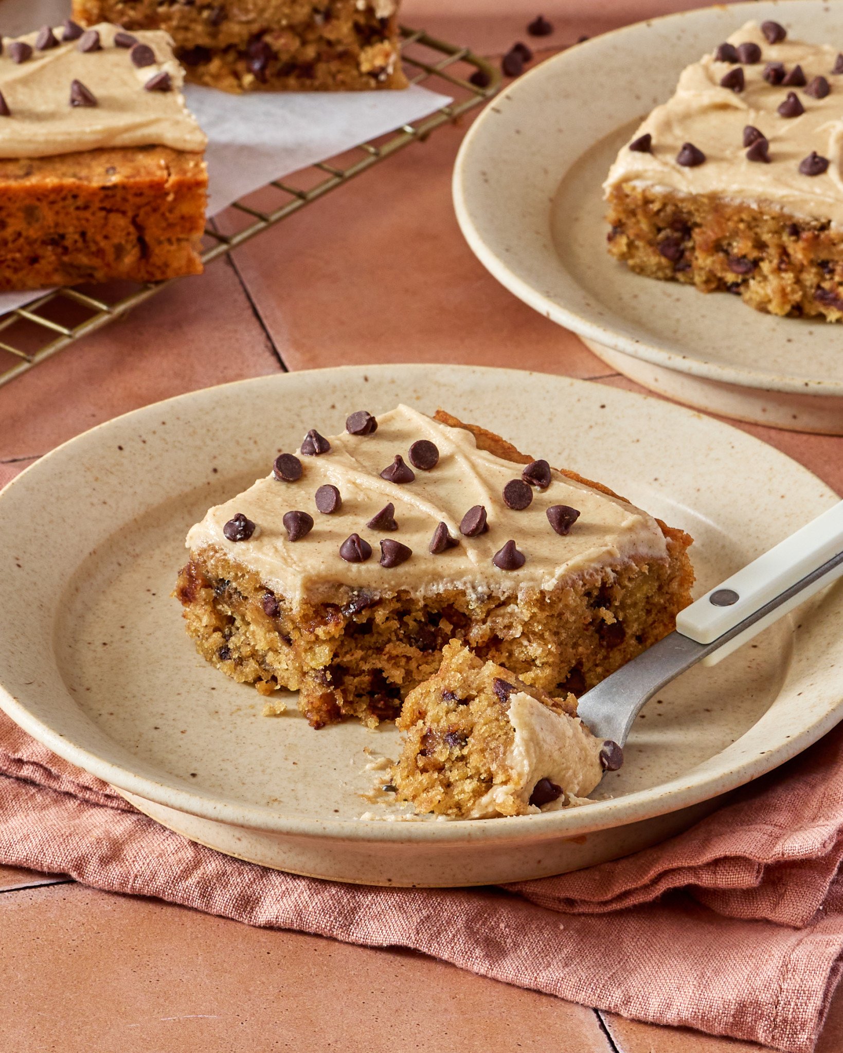 Sprinkle more mini chocolate chips on top, gently pressing them into the frosting to stick. Cut and enjoy.