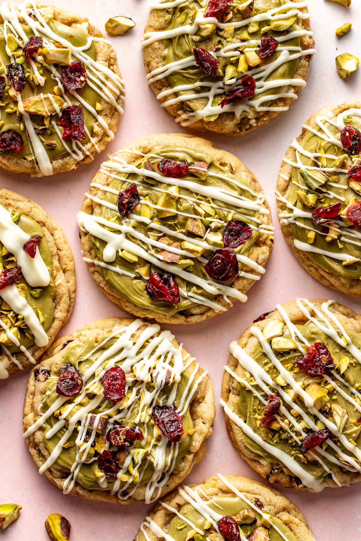 spoon some of the pistachio butter over each cookie, sprinkle with crushed pistachios and chopped dried cranberries for a festive touch and a drizzle of white chocolate.