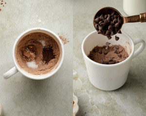 Mix dry ingredients: in a 10-12 oz. microwave safe mug, mix together the flour, sugar, cocoa powder, espresso powder and salt. Stir in the chocolate chips.
