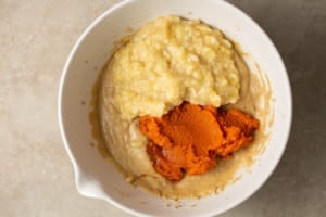Then whisk in the pumpkin puree, bananas, and vanilla. It will look a little coagulated at this point, it's OK.